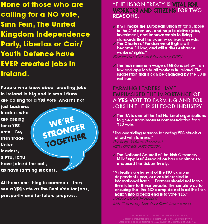 “A YES Vote Is The Best Vote For JOBS and WORKERS’ RIGHTS” – Fianna Fail Yes to Lisbon 2 leaflet » fflisbon2