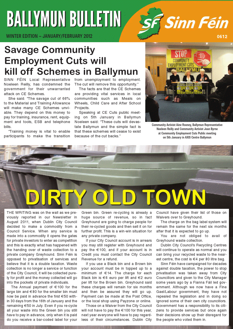 The January February 2012 edition of “Ballymun Bulletin” from Sinn Fein Dublin North West TD Dessie Ellis.