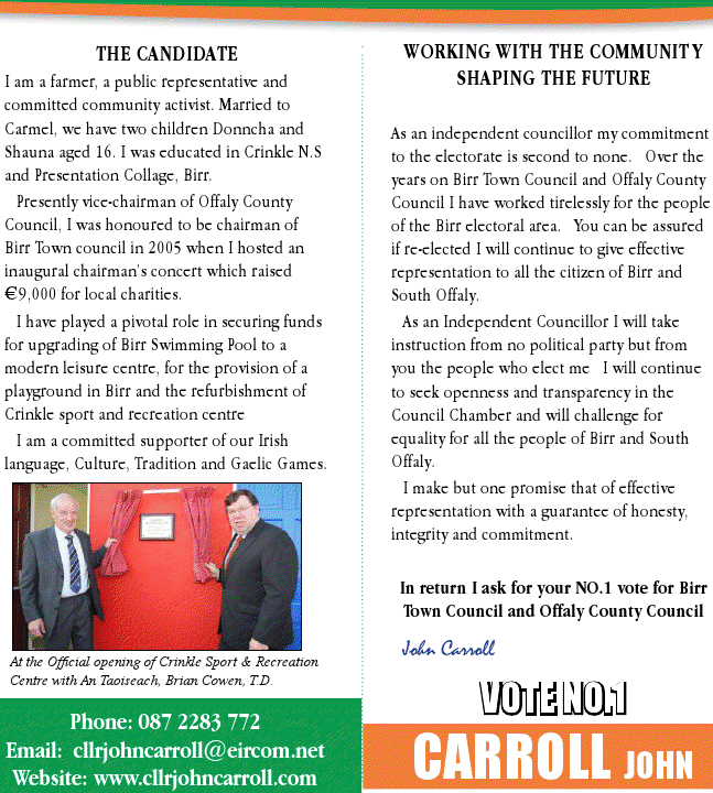 Leaflet for John Carroll -Independent – Birr-Offaly Co Council 2009 Local Elections » jcarroll09b