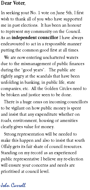 Leaflet for John Carroll -Independent – Birr-Offaly Co Council 2009 Local Elections » jcarroll09c