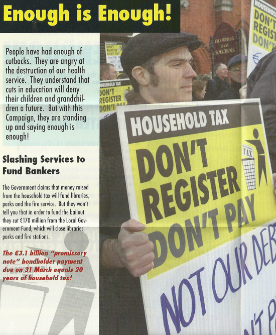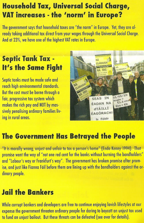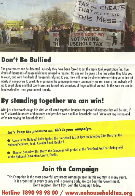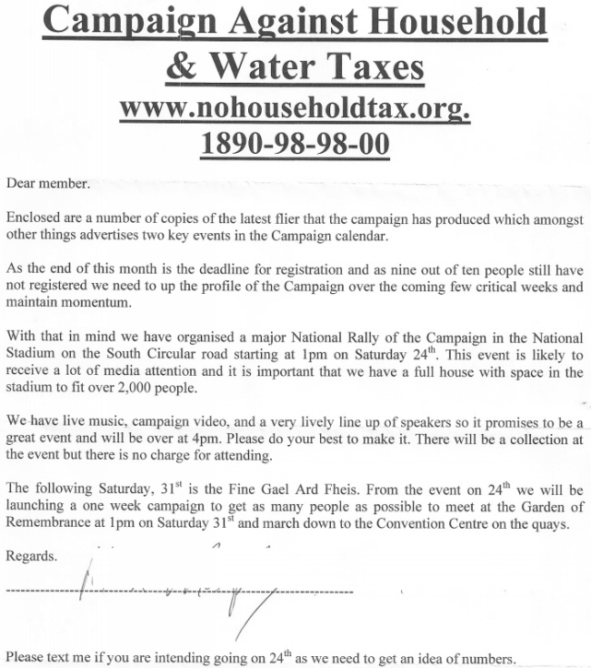 A leaflet and letter from the Campaign against Household & Water Taxes giving details of the forthcoming National Rally on the 24th of March and the protest outside the Fine Gael Ard Fheis on the 31st of March.