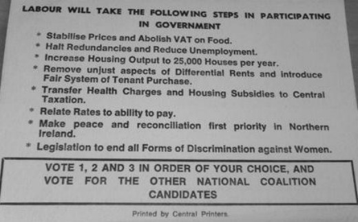 From the 1973 General Election a flyer from Labour Party Dublin North East candidates Conor Cruise O’Brien, Joe O’Connor and Paddy Dunne. Cruise O’Brien was elected with 7,774 votes, Dunne polled 3,106 votes and missed out whilst O’Connor polled 1,451 votes.