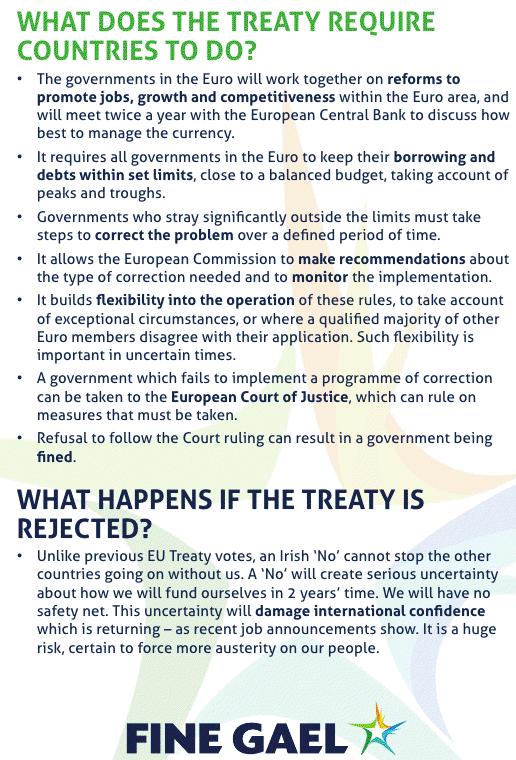 A leaflet produced by Fine Gael for the Forthcoming Fiscal Treaty Referendum. The headline being “This Treaty supports jobs and recovery. It protects all our interests – yours, mine and our children’s.”