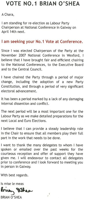 Brian O’Shea ‘for Party Chairperson’ Leaflet from the 2012 Labour Conference » boshea12c