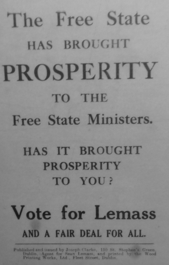 “The Free State has Brought Prosperity to the Free State Ministers . Has it Brought Prosperity to You? …Vote For Lemass and a Fair Deal For All”