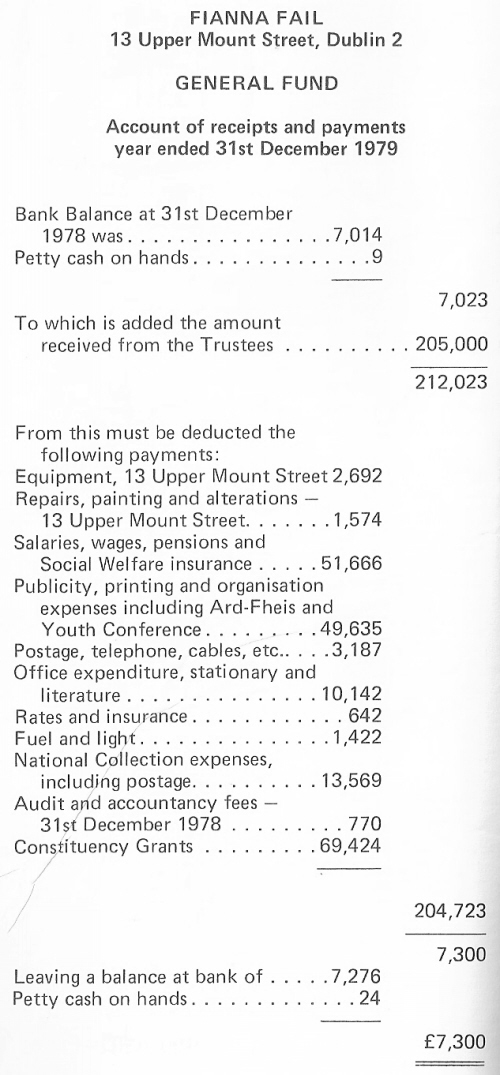Summary of Fianna Fails 1979 Accounts with note from Auditor and Party Treasurer » funds1980ardfheis