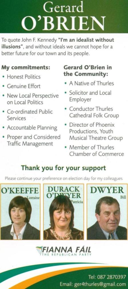 Leaflet from Gerard O’Brien- Fianna Fail -Thurles Town Council 2009 Local Elections » Gerard O’Brien Back