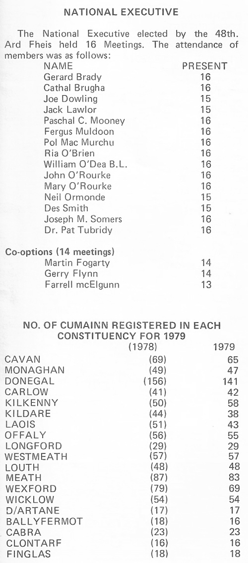 From the Clar of the 1980 Fianna Fail Ard Fheis the report of the National Executive by Liam O’Rian.We also have details of the Fianna Fail National Executive with the number of meetings attended by each member. Also of interest is the Number of Cumainn registered in each constituency for 1979 with details of the 1978 numbers. Donegal had the most and there was total of 2,475 Cumainn Nationally.