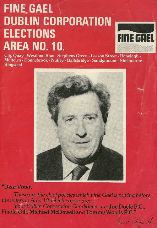 From the 1979 Local Elections a leaflet for Fine Gael candidates Michael McDowell, Joe Doyle, Tommy Woods and Finola Gill (who later married John Bruton). Joe Doyle was elected. McDowell polled 1271 votes, Gill 960 and Woods 497.