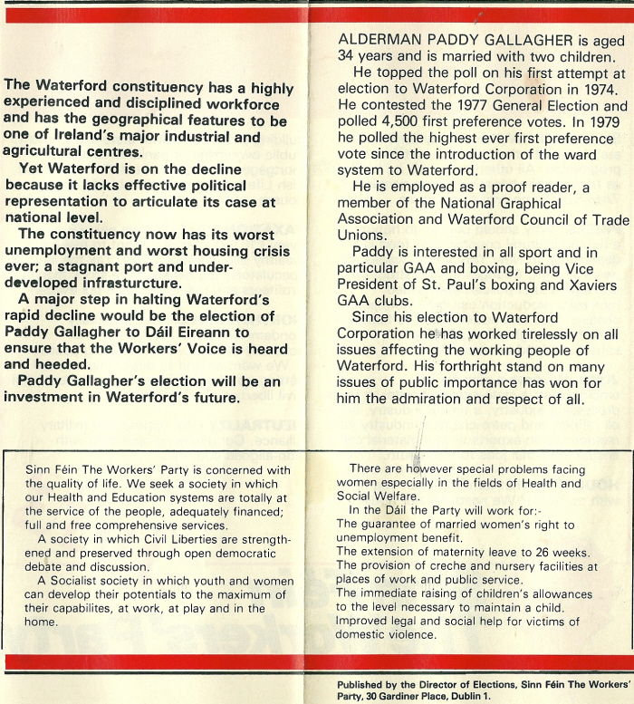 Leaflet from Paddy Gallagher -Sinn Fein The Workers’ Party- 1981 General Election -Waterford » pgallagher81b