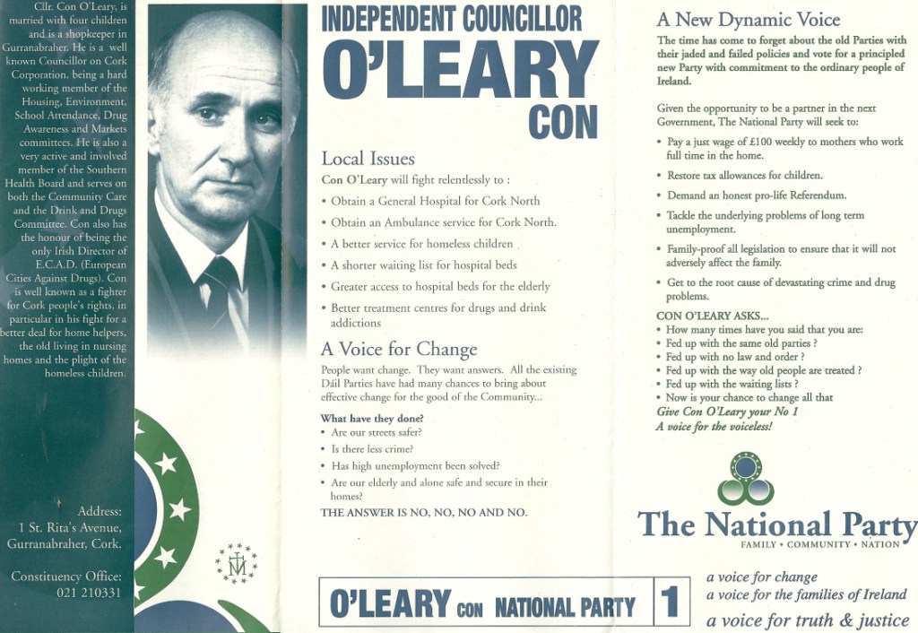 Leaflet from Con O’Leary -The National Party -1997 General Election Cork North Central » coleary3