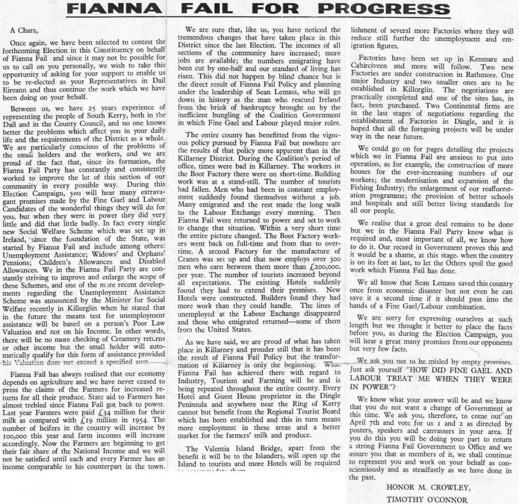 “Let Lemass Lead On”- 1965 leaflet from Honor Crowley, Tim ‘Chub’ O’Connor -Fianna Fail -Kerry South » lemasskeryys65d
