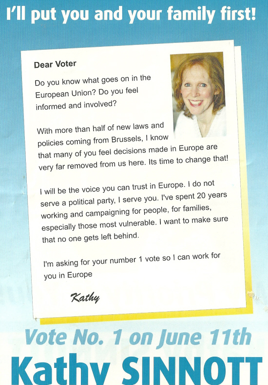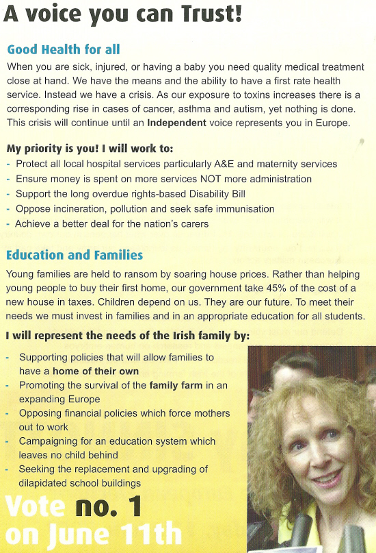 From the 2004 European Elections a leaflet for Kathy Sinnott who was running as an Independent in the South constituency. She was elected polling over 89,000 votes. She is associated with campaigning for the rights of Autistic Children.
