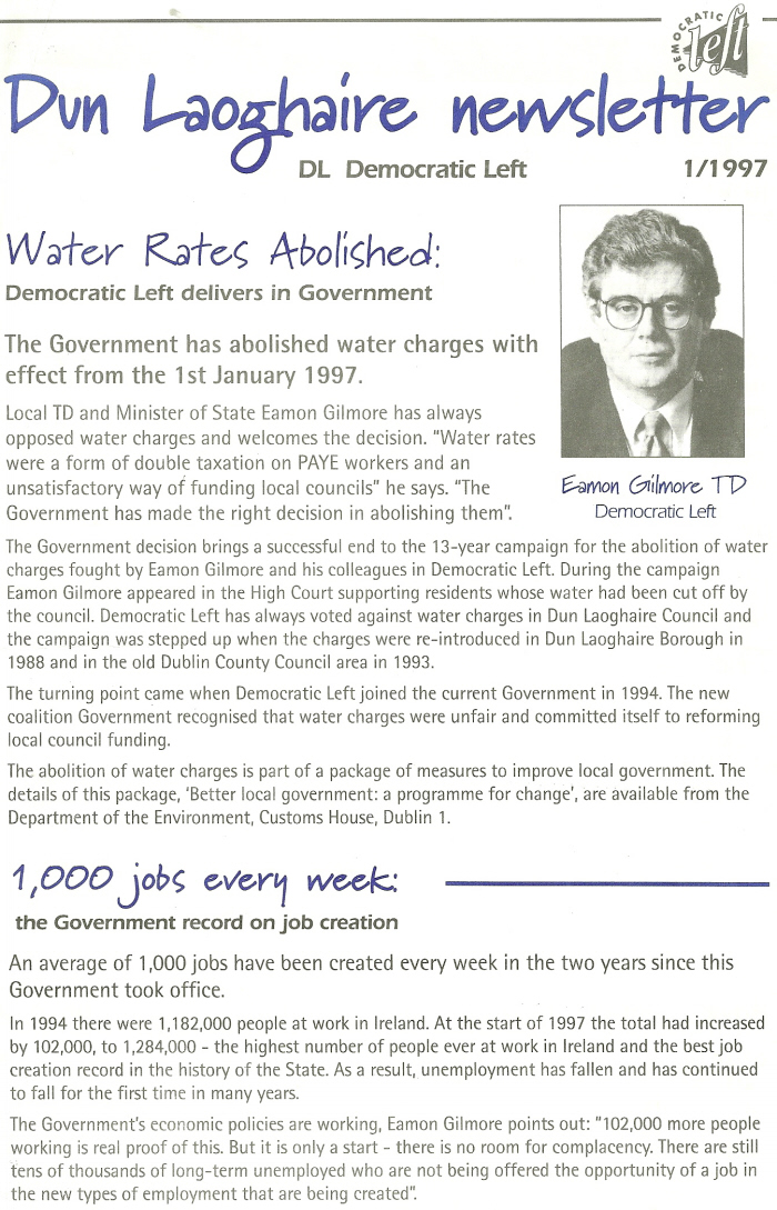 “Dun Laoghaire Newsletter.. Water Rates Abolished:” -Eamon Gilmore -Democratic Left- 1997 General Election Dun Laoghaire » dunLnews97a