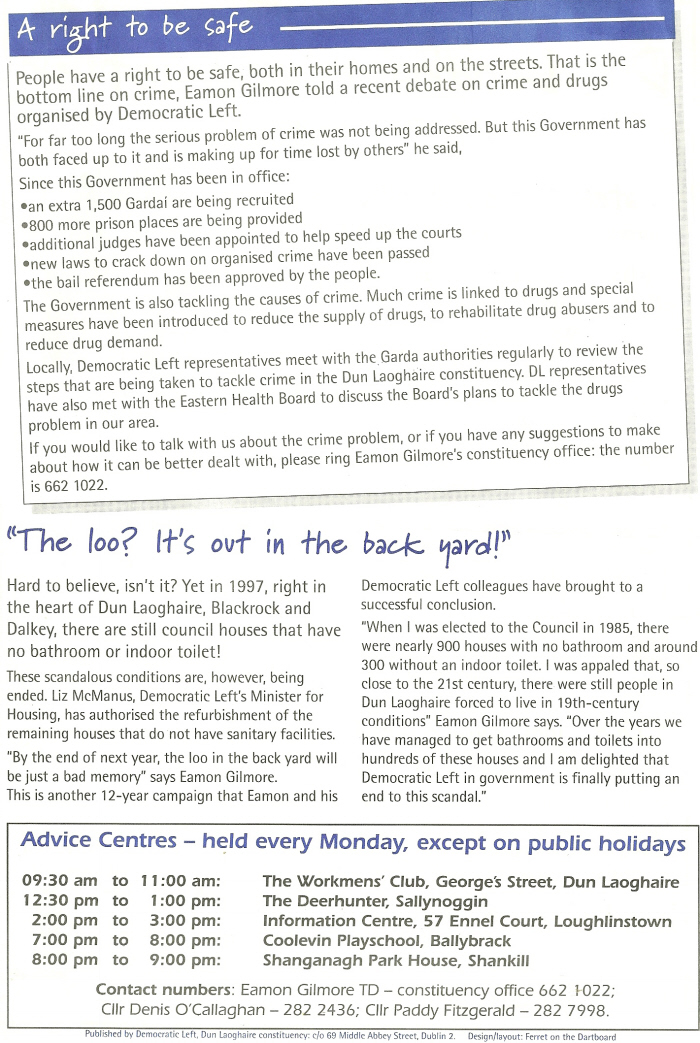 “Dun Laoghaire Newsletter.. Water Rates Abolished:” -Eamon Gilmore -Democratic Left- 1997 General Election Dun Laoghaire » dunLnews97b