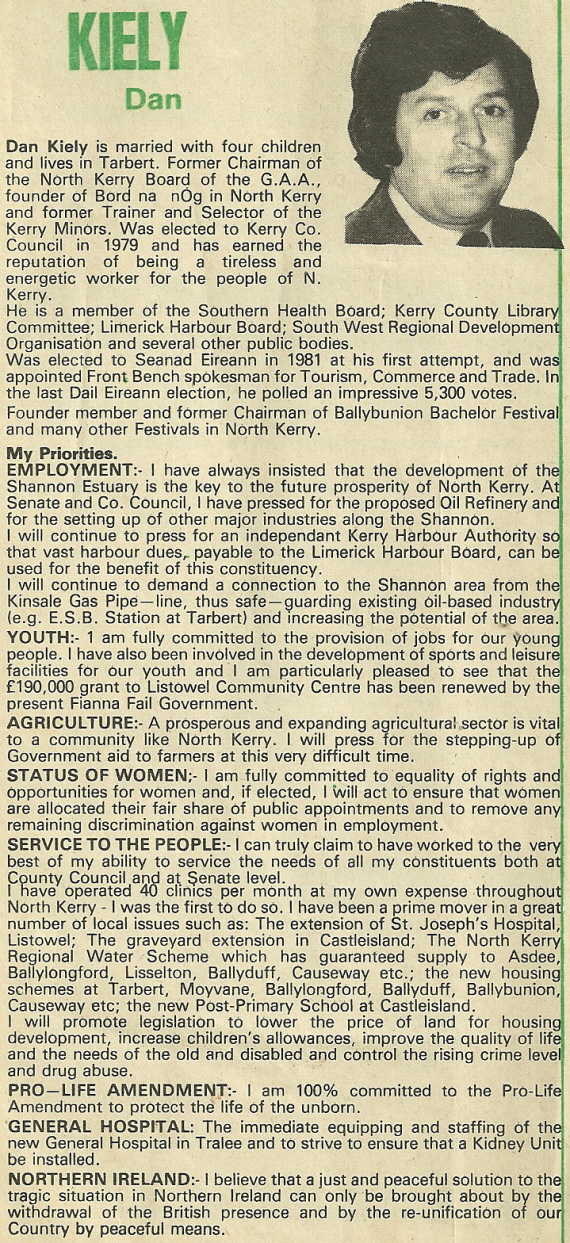 November 1982 Leaflet for Dan Kiely, Denis Foley , Tom McEllistrim -Fianna Fail -Kerry North » nkerrynov82d