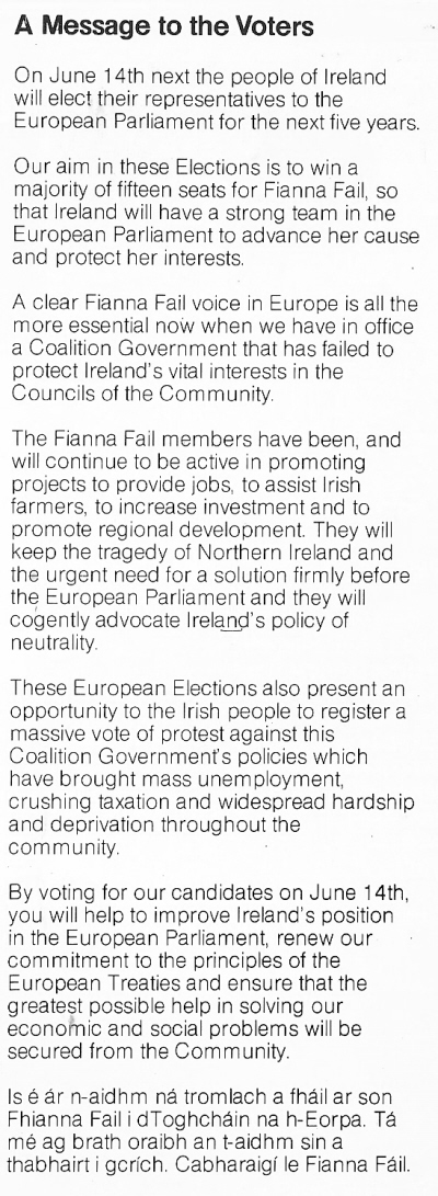 Leaflet for Sylvester Barrett, Gene Fitzgerald, Noel Davern -Fianna Fail -1984 European Elections -Munster » munster1984b