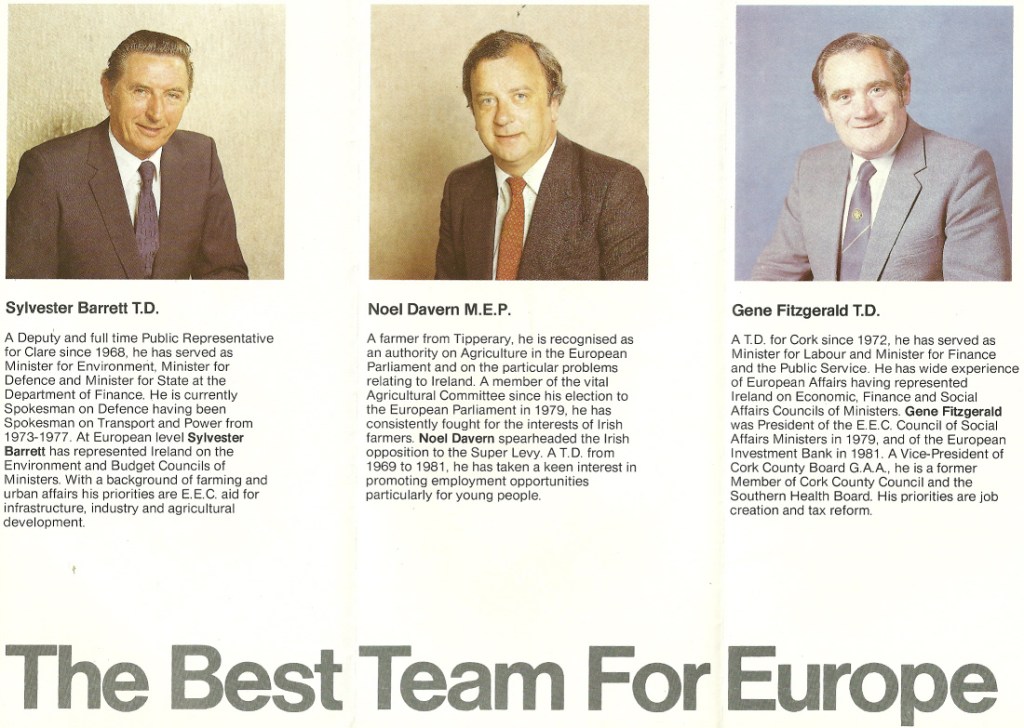 Leaflet for Sylvester Barrett, Gene Fitzgerald, Noel Davern -Fianna Fail -1984 European Elections -Munster » munster1984c
