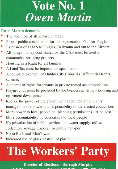 Leaflet from Owen Martin -Workers Party -2004 Local Elections – Finglas » omartin04b