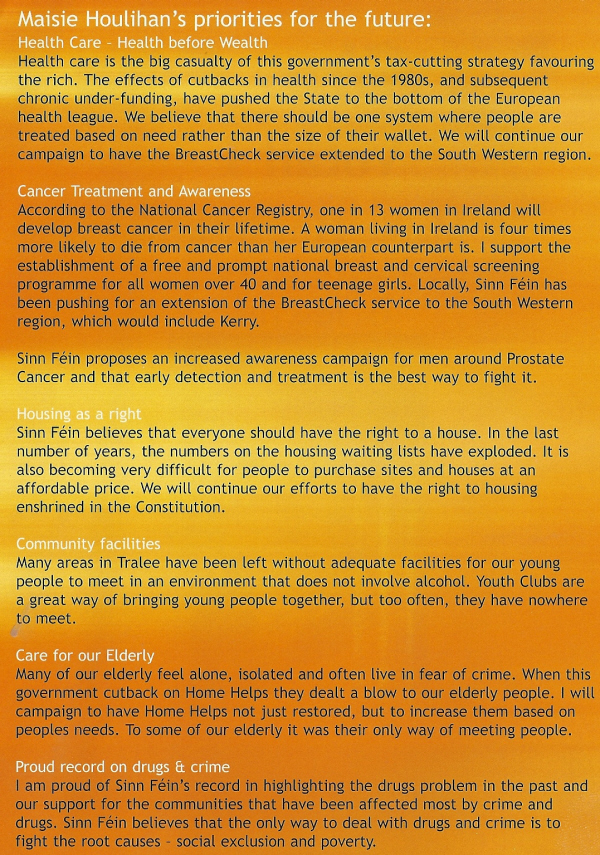 Leaflet from Maisy Houlihan /David Cullinane -Sinn Fein 2004 Local and European Elections -Tralee / South » mhoulihan04b
