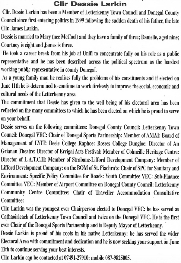 Leaflet from Dessie Larkin, Maureen McLaughlin-Independent Fianna Fail -Letterkenny -2004 Local Elections » larkinmclaughlin04b