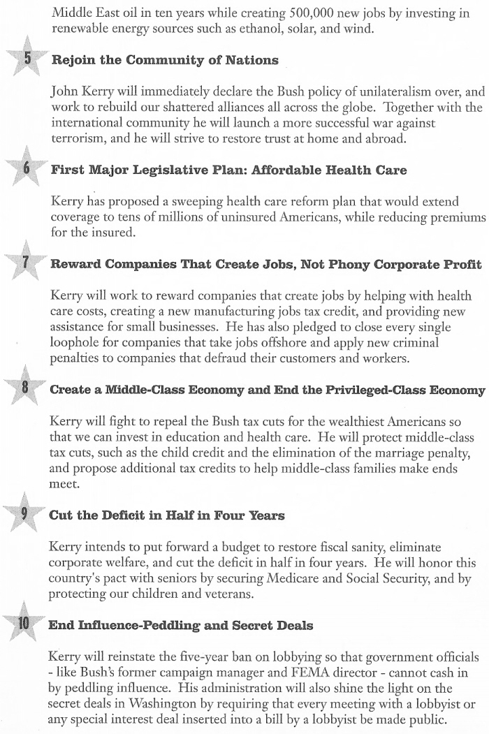Although not Irish, I thought this leaflet may be of interest. From the 2004 American Presidential Election, “100 Days To Change America” John Kerry’s Action Plan For His First 100 Days in Office.