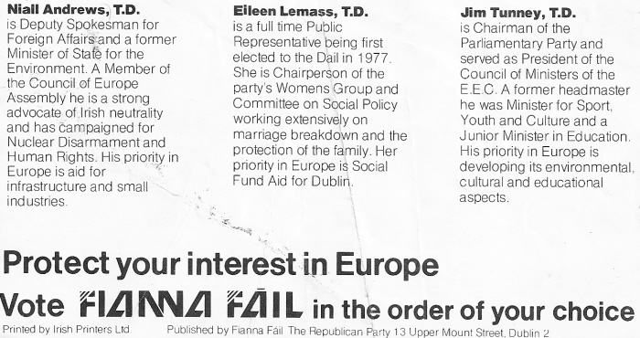 From the 1984 European Elections a leaflet from Fianna Fail Dublin candidates Niall Andrews, Eileen Lemass and Jim Tunney. Lemass and Andrews were elected.
