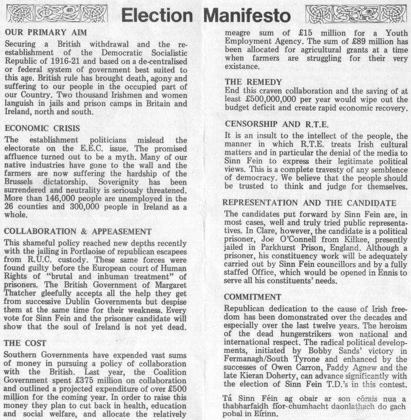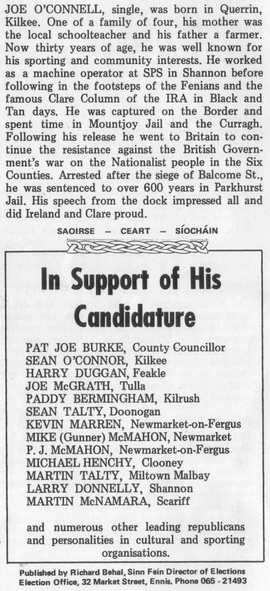 From the February 1982 General Election a leaflet from Sinn Fein candidate Joe O’Connell running in Clare. O’Connell, then a prisoner in Parkhurst Jail polled 1,233 votes.