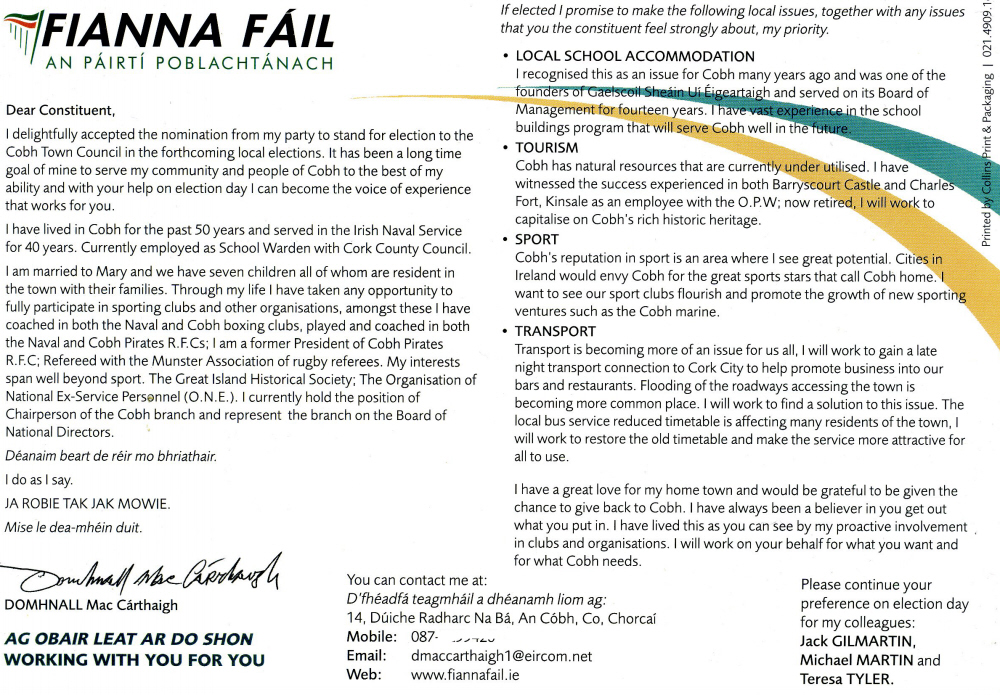 Leaflet from Domhnall Mac Carthaigh -Fianna Fail – Cobh Town Council -2009 Local Elections » DMC2
