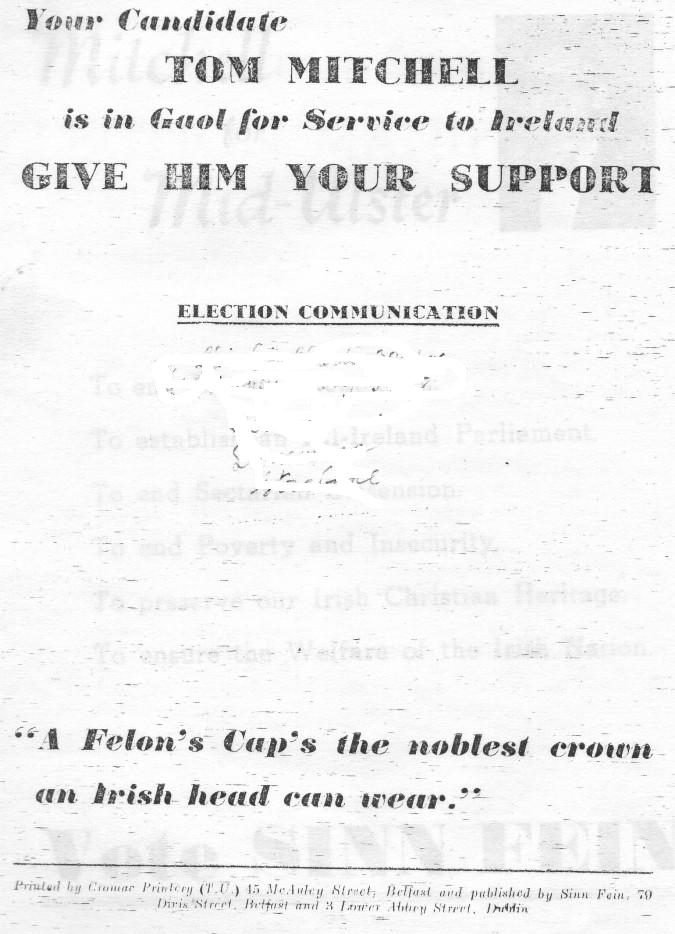 “A felon’s cap’s the noblest crown. An Irish head can wear.” Leaflet from Tom Mitchell -Sinn Fein -1956 Mid Ulster By-Election » mitchell56b