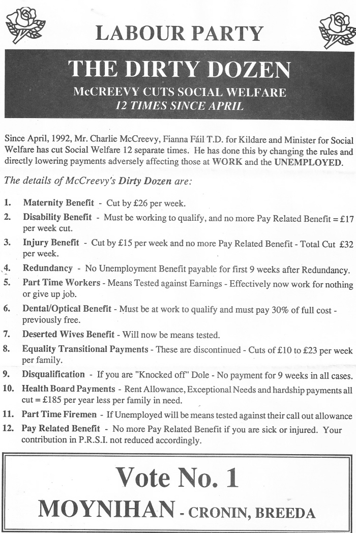 From 1992 “The Dirty Dozen -McCreevy cuts Social Welfare 12 times since April” Leaflet from Breeda Moynihan Cronin -Labour Party -Kerry South » dirtydozen92moynihan