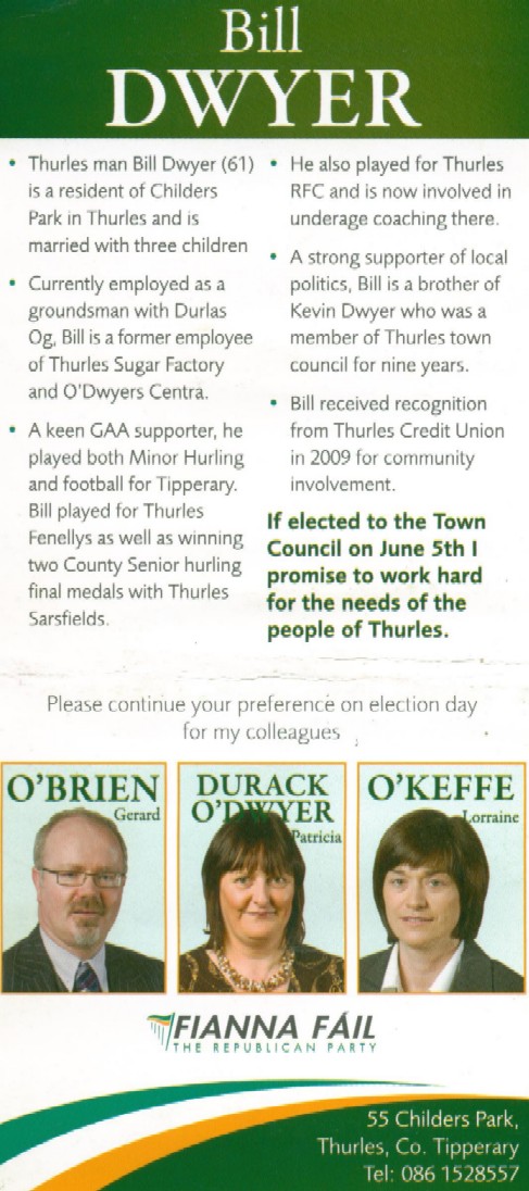 From the 2009 Local Elections a flyer from Bill Dwyer running for Fianna Fail for Thurles Town Council. He finished 10th just outside the seats.
