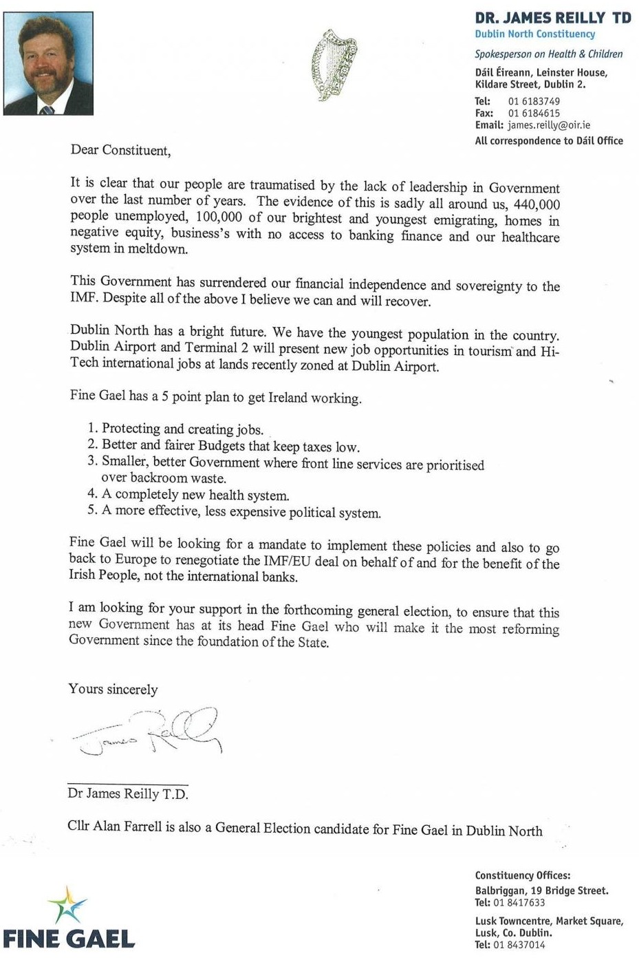 James Reilly letter to electors Dublin North -2011 General Election » jreillyletterDNorth2011a