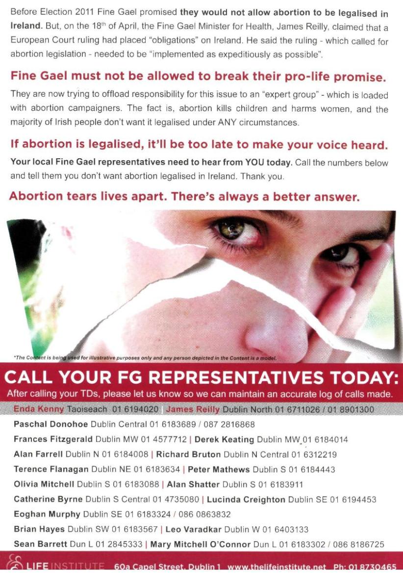 Flyer from ‘The Life Institute’ asking people to contact their Fine Gael TDs looking for an Abortion Referendum » lifein4