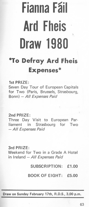 From 1980 Ads for the Fianna Fail ‘Disco Dance’ (with Larry Gogan) and the ‘Fianna Fail Ard Fheis Draw ‘ » ff1980draw