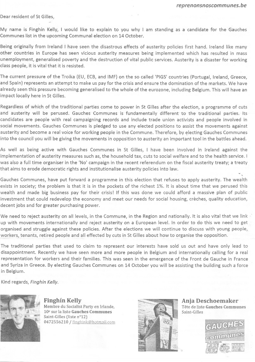 Leaflet in English and French from Finghín Kelly -Gauches Communes list in Saint Gilles, Brussells » fkellyeng1