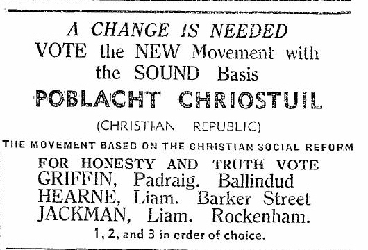 Ads for An Poblacht Chríostúil (Christian Republic) 1960 LE Waterford and 1965 GE Cork » pobch1960wford