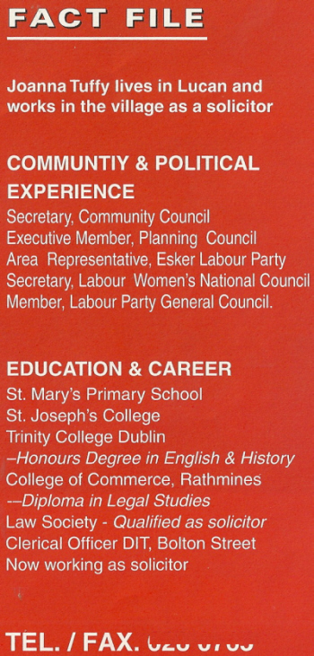 1999 Local Elections leaflet from Joanna Tuffy -Labour -Lucan » jtuffy99b