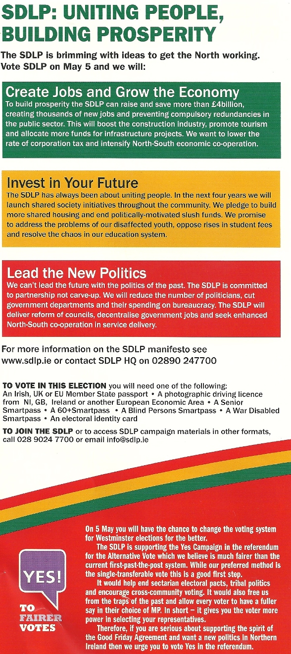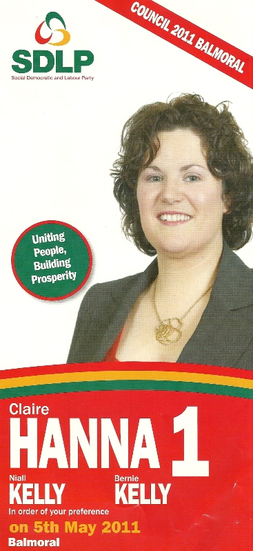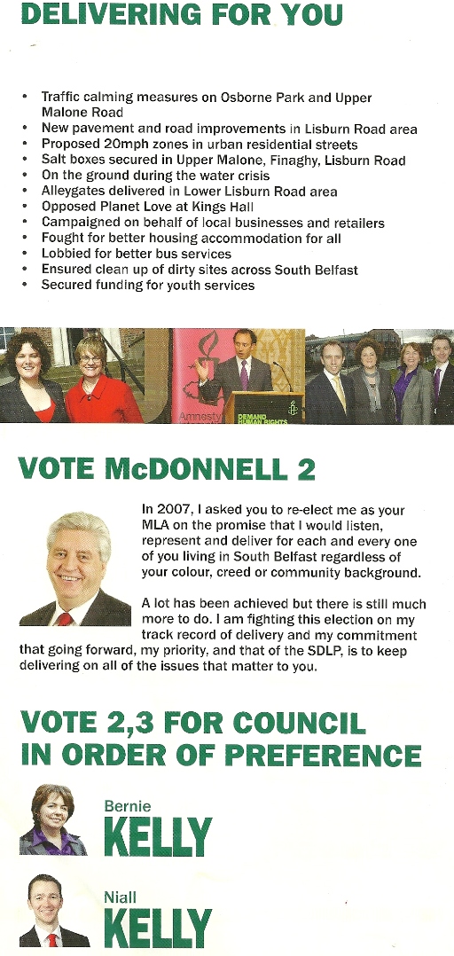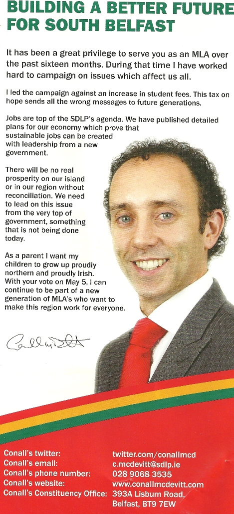 From the 2011 Assembly elections and Local Elections an SDLP Leaflet for Conall McDevitt and Alasdair McDonnell who were running for the Assembly in Belfast South. The leaflet is also for Balmoral Local Election candidates Claire Hanna, Bernie Kelly and Niall Kelly.