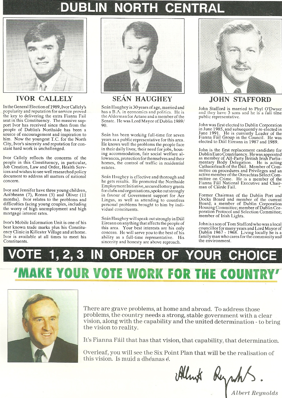 1992 leaflet from Ivor Callely, Sean Haughey, John Stafford- Fianna Fail -Dublin North Central » ffdnc92a