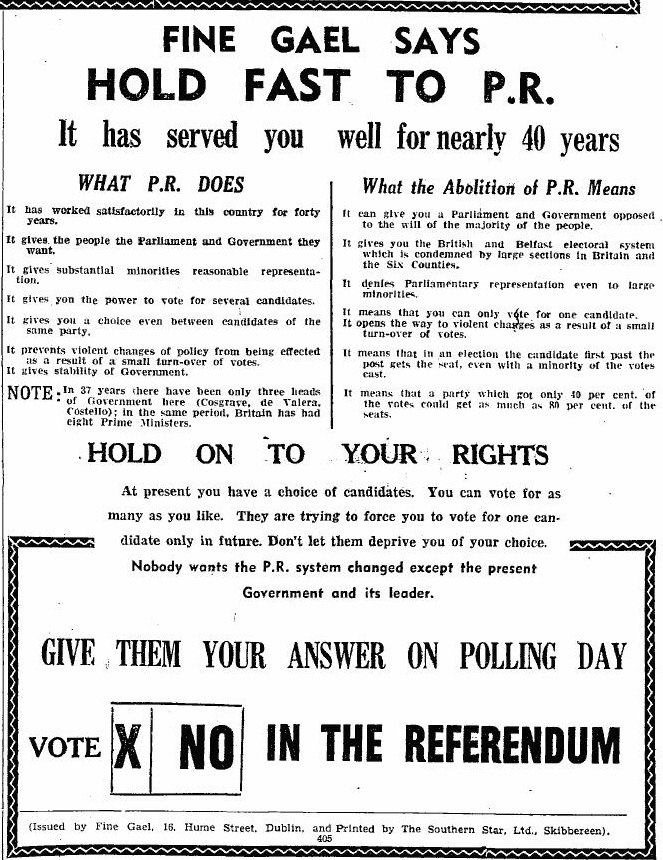 “Fine Gael Says Hold Fast To P.R.” Vote No – 1959 Referendum on the Voting System. » fgpr59b