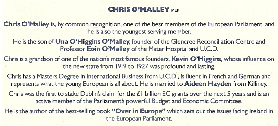Flyer from Chris O’Malley -Fine Gael -1989 European Elections -Dublin » comalley2