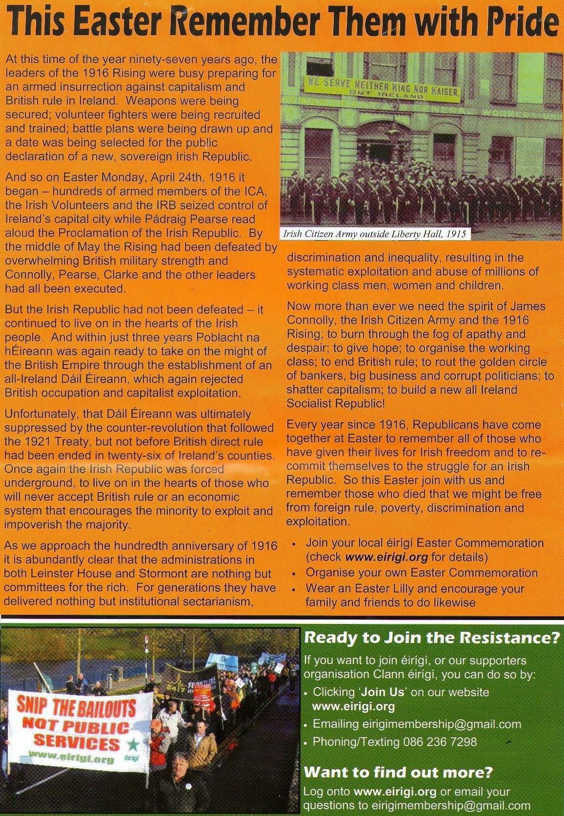 A leaflet from Éirígí,’Poblacht na nOibrithe’ Earrach 2013 …”Home and Water Taxes Must be Stopped” and a piece on the Eater rising.