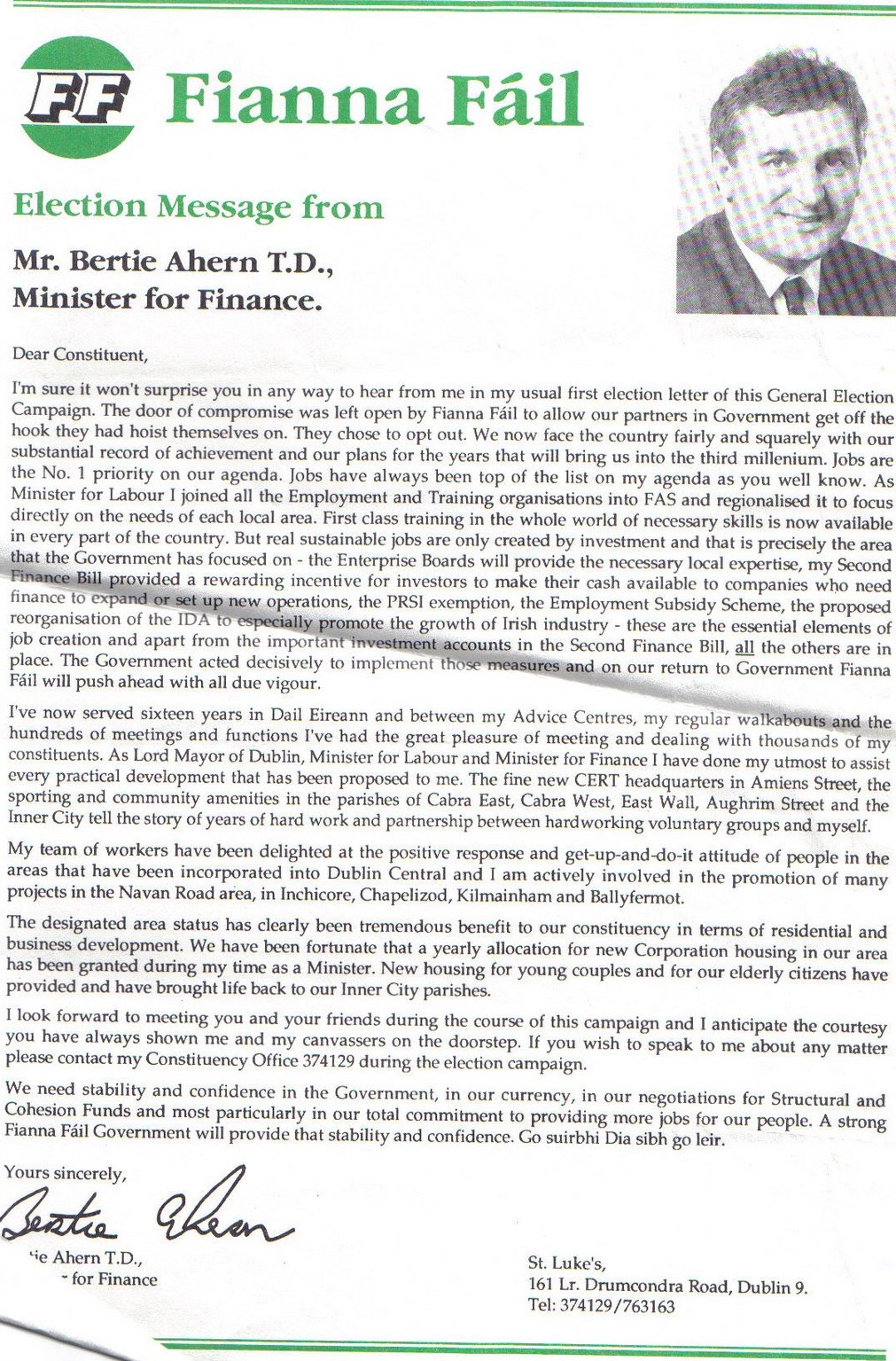 From 1992 “Election Message from Mr. Bertie Ahern T.D., Minister for Finance” -Fianna Fail -Dublin Central » bertielet3