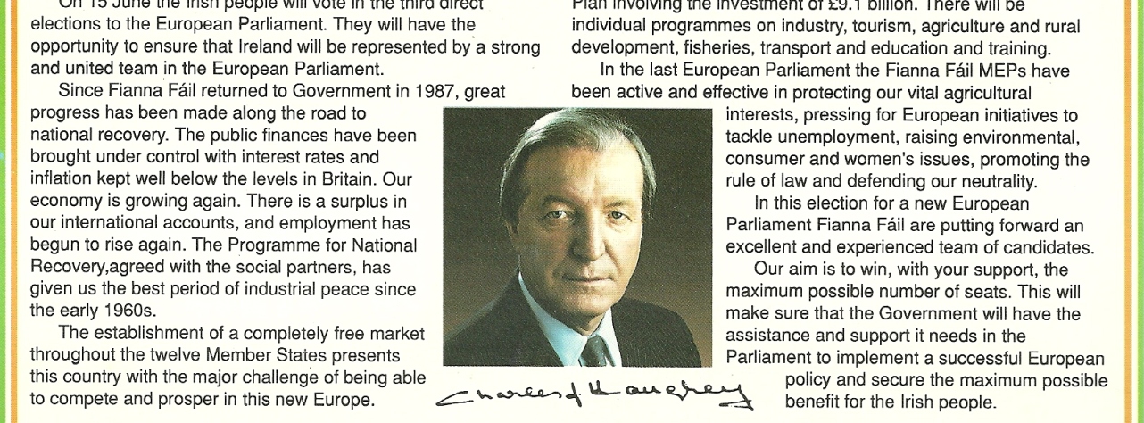 From the 1989 European Elections a leaflet from Fianna Fail Dublin candidates Niall Andrews and Eileen Lemass. Both were outgoing MEPS however Eileen Lemass lost her seat.
