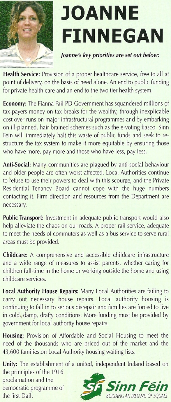 Leaflet from Joanne Finnegan- Sinn Fein -Meath East 2007 General Election » jfinnegan07b