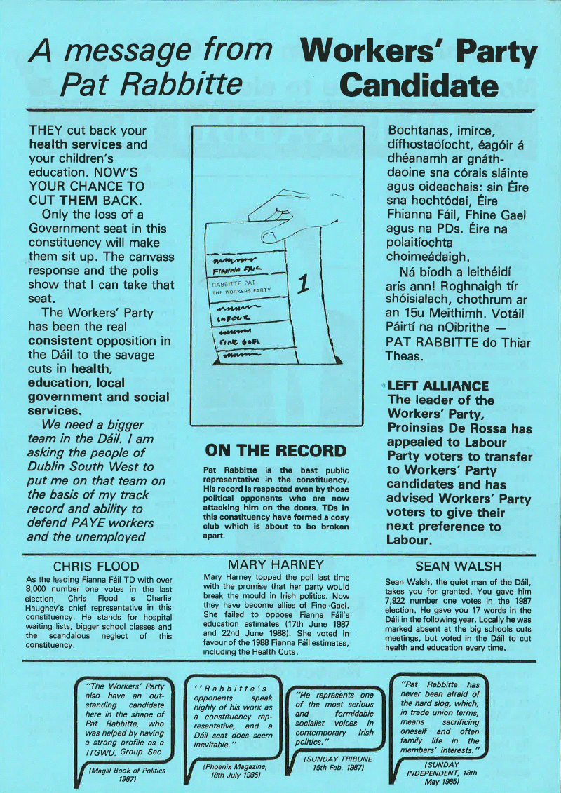 “Reject the Old Politics -Vote Pat Rabbitte Number 1” -Workers Party -1989 General Election -Dublin South West » rabbitte89b
