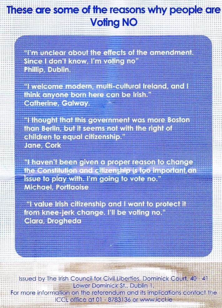 From the 2004 Citizenship Referendum a leaflet from the Irish Council for Civil Liberties urging a No vote.