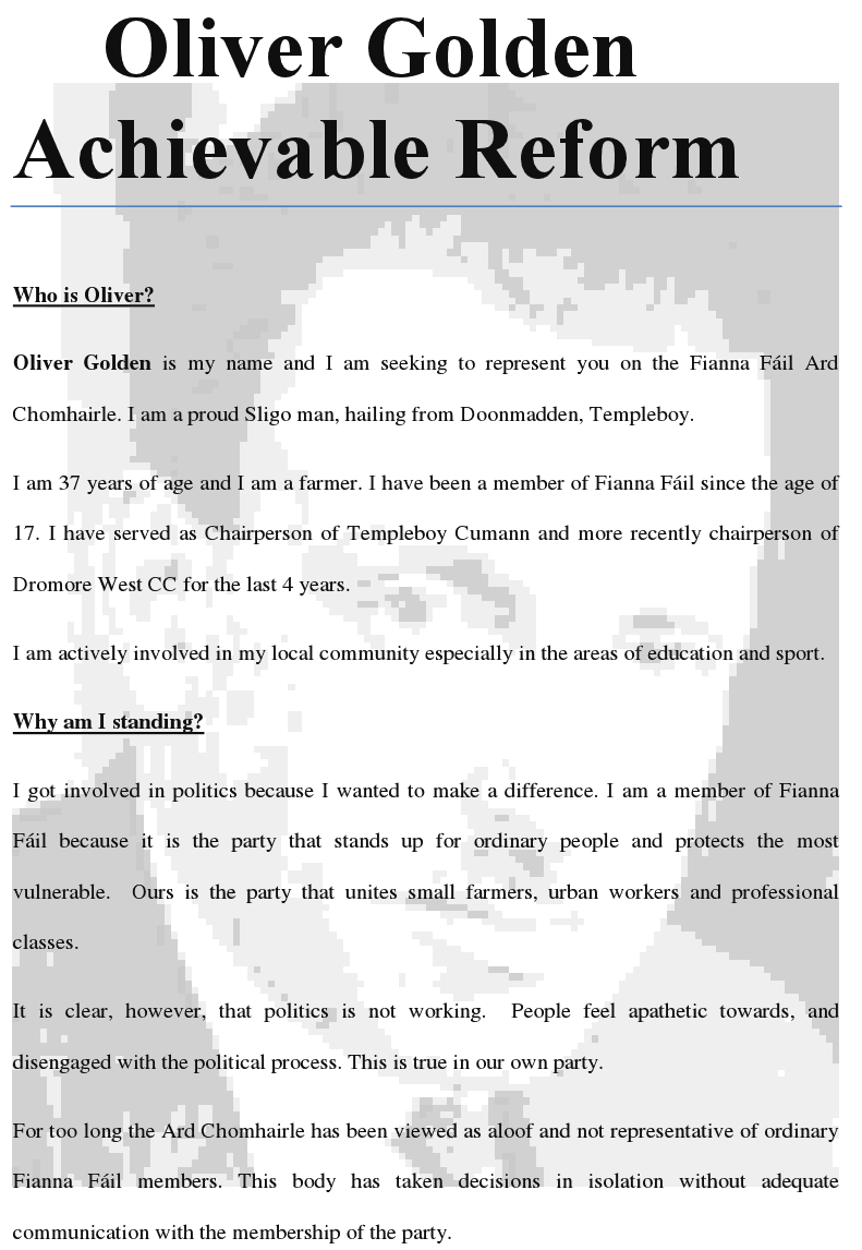 Leaflet from Oliver Golden -Fianna Fail Committee of 20 Elections » golden1