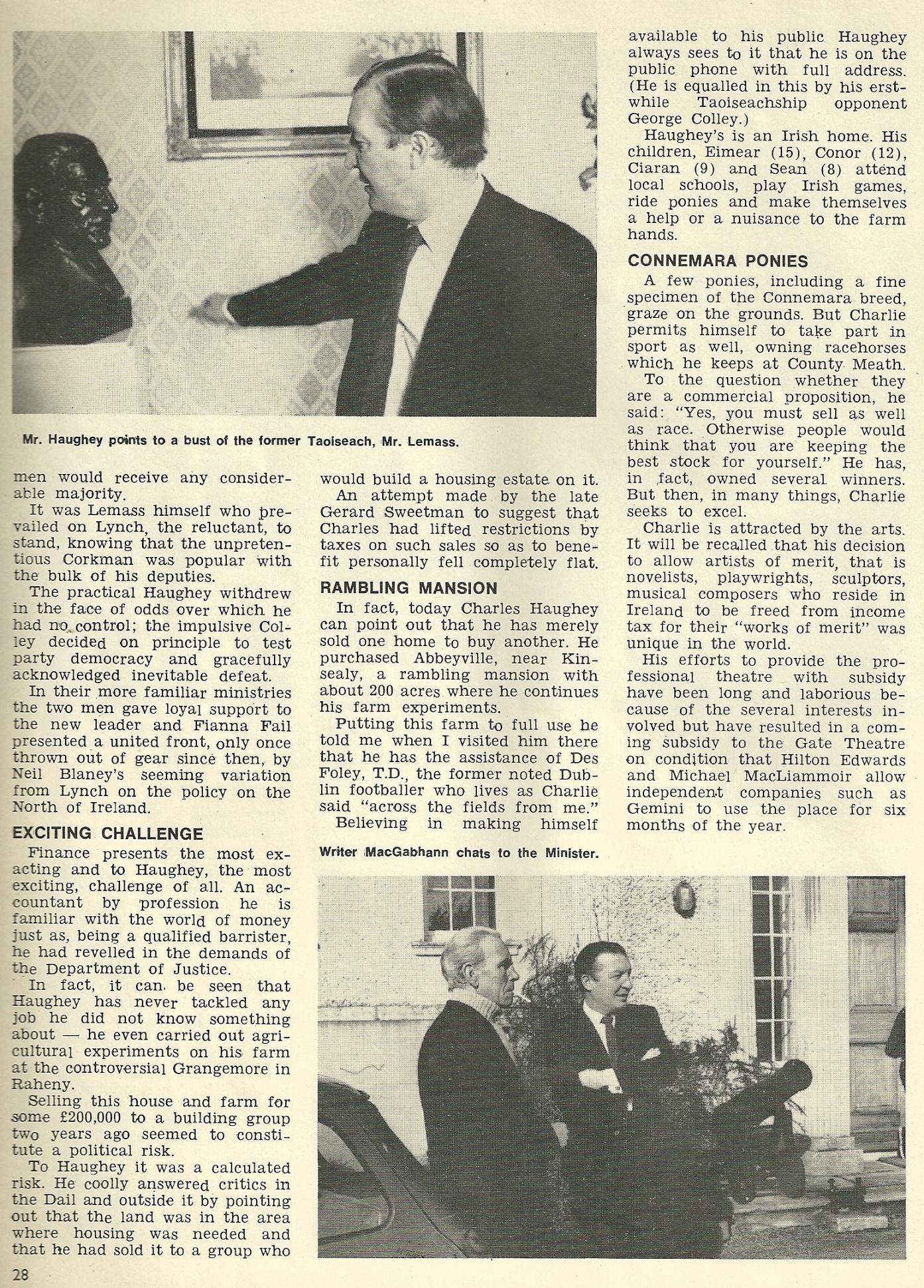From ‘This Week’ magazine April 1970 a profile of a pre Arms trial Charles Haughey. In an almost ‘Hello’ type interview and profile that feautures his family, his horses and much more. The question of the sale of house and lands in Raheny to builders is glossed over. Still worth a read.